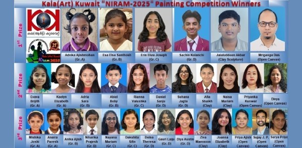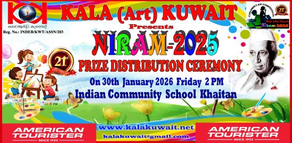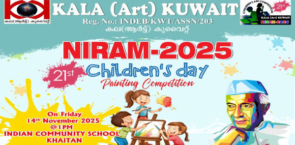 Kala (Art) Kuwait presents “NIRAM-2025” Children’s Day Painting Competition in association with ‘American Tourister’, will be held on Friday,On Friday, 14h November 2025 @1PM INDIAN COMMUNITY SCHOOL, Khaithan on the occasion of Children's Day celebration by marking the birth day of Pandit Jawaharlal Nehru, the First Prime Minister of India. Kala(Art) Kuwait is delighted to celebrate 21st Anniversary of “NIRAM” Painting Competition which is opened for all students of Indian Schools in Kuwait.